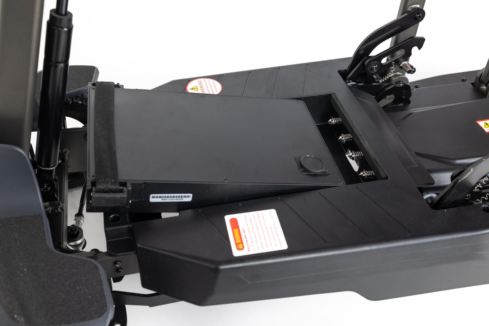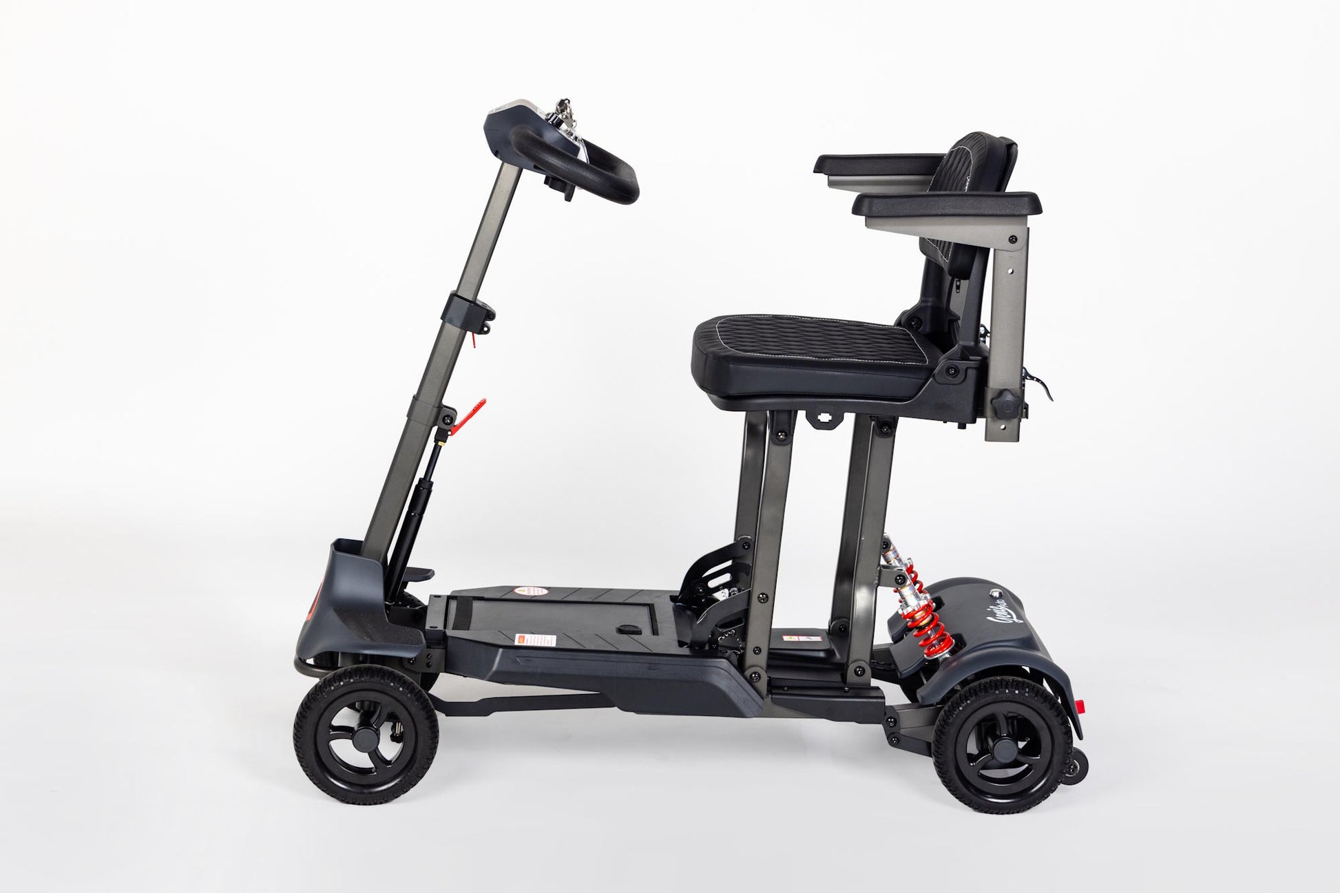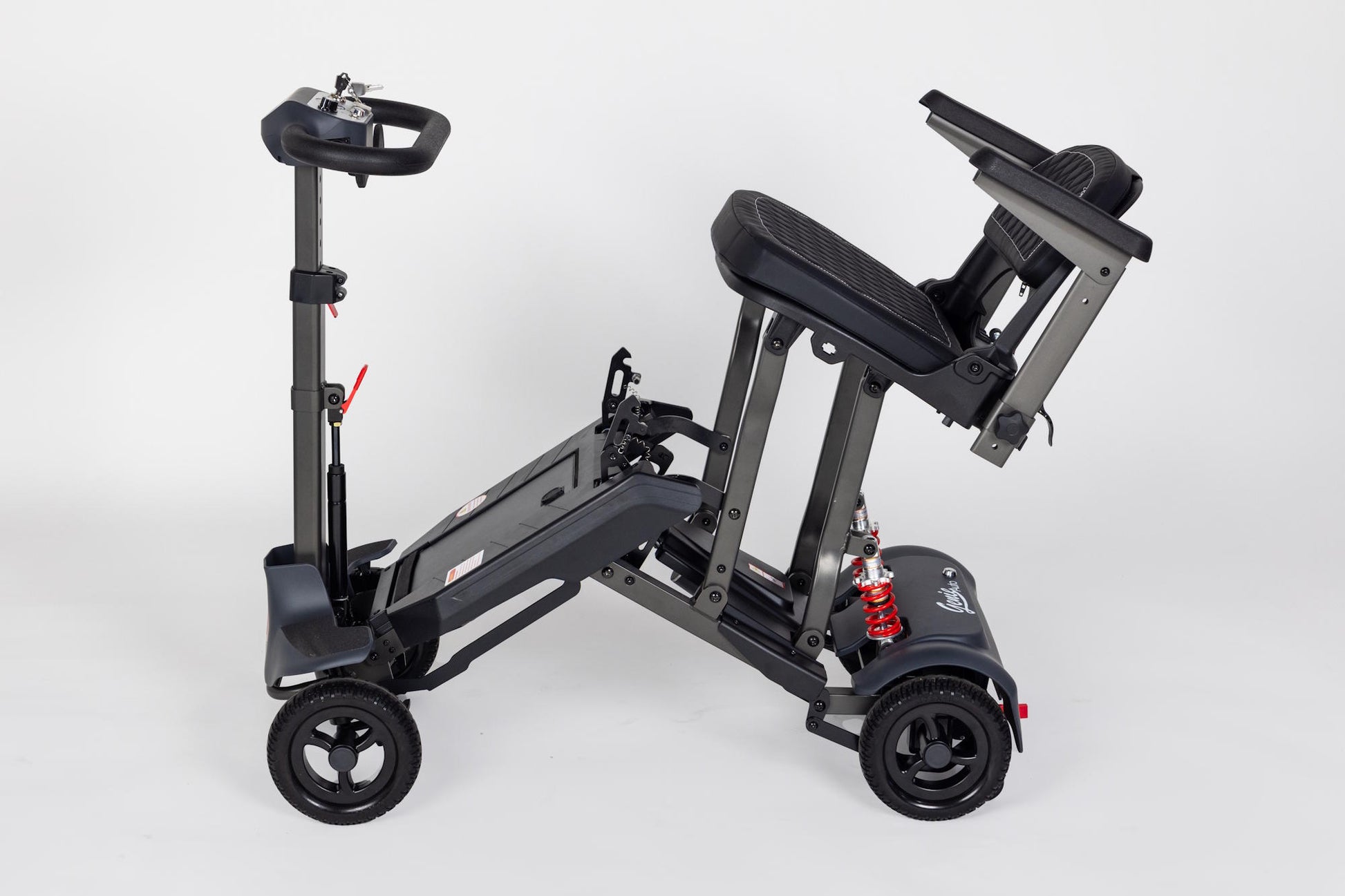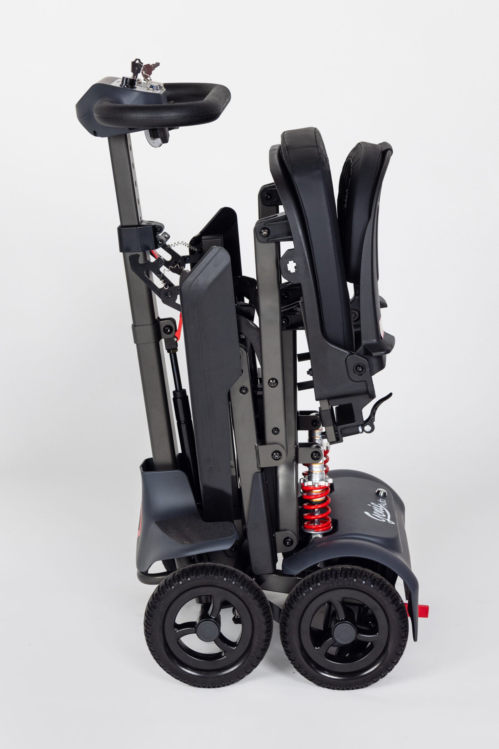A sister to the original Genie scooter, the Genie Auto has all of the features of the Genie - a lightweight magnesium frame (typically 6kg lighter than the comparable Solax models), LED front light, off and on-board charging, rear suspension, 2 person lifting handles, tiller charging point. It also crucially has a fob which closes and opens on a single push of a button; doing so in a matter of seconds.